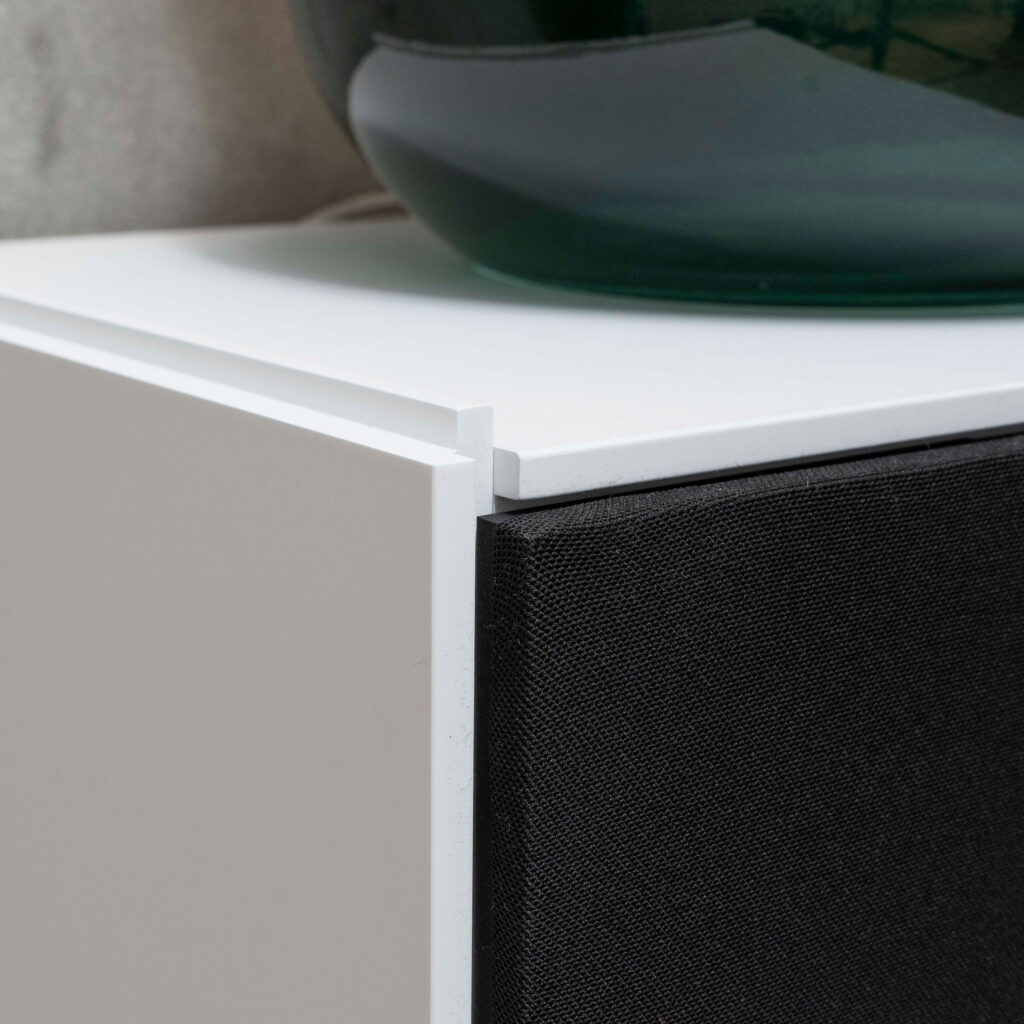 Vi monterer som standard vores låger i 14 forskellige farver højttalerstof, som er designet til optimal lydgennemtrængning, så højttalere kan placeres inde i møblet