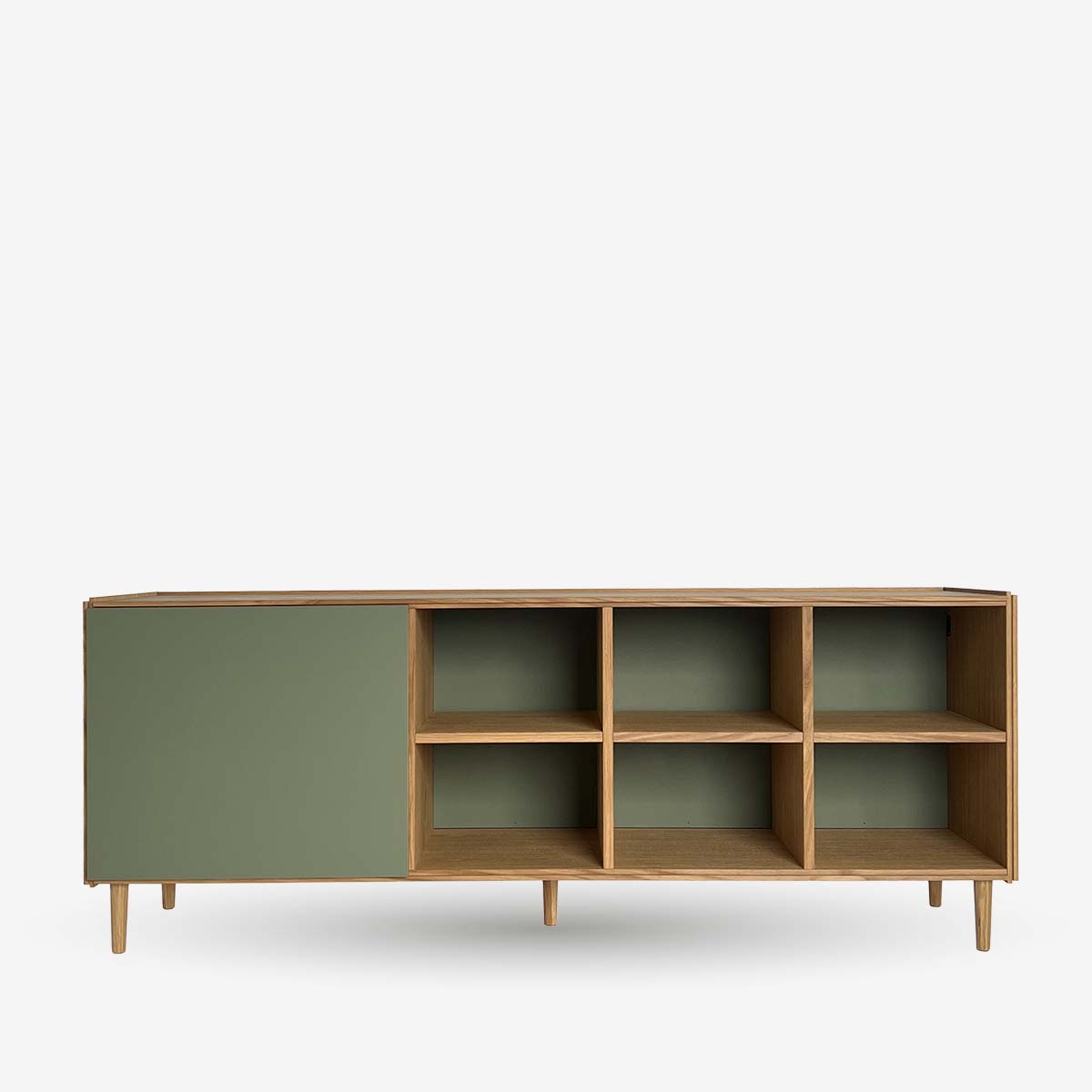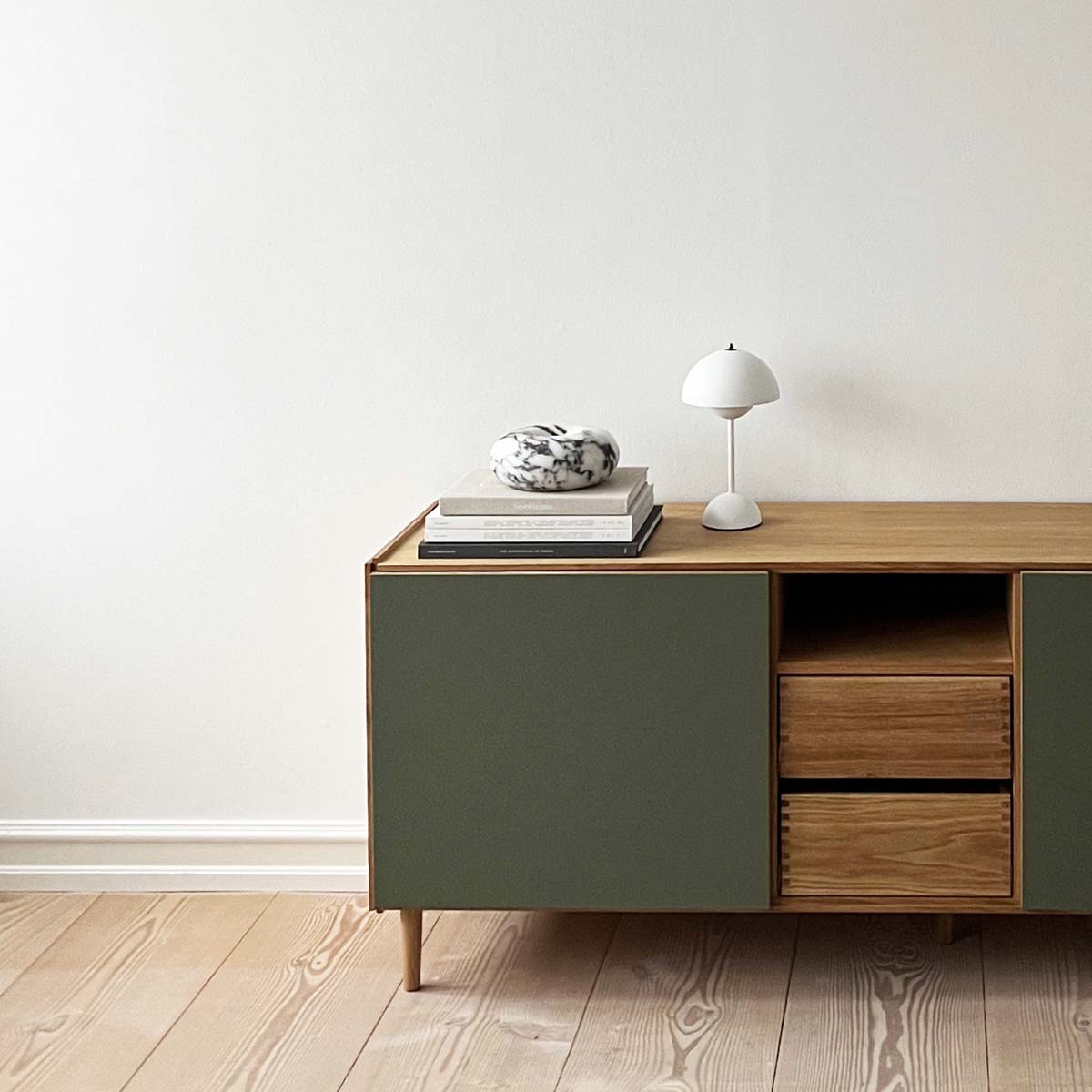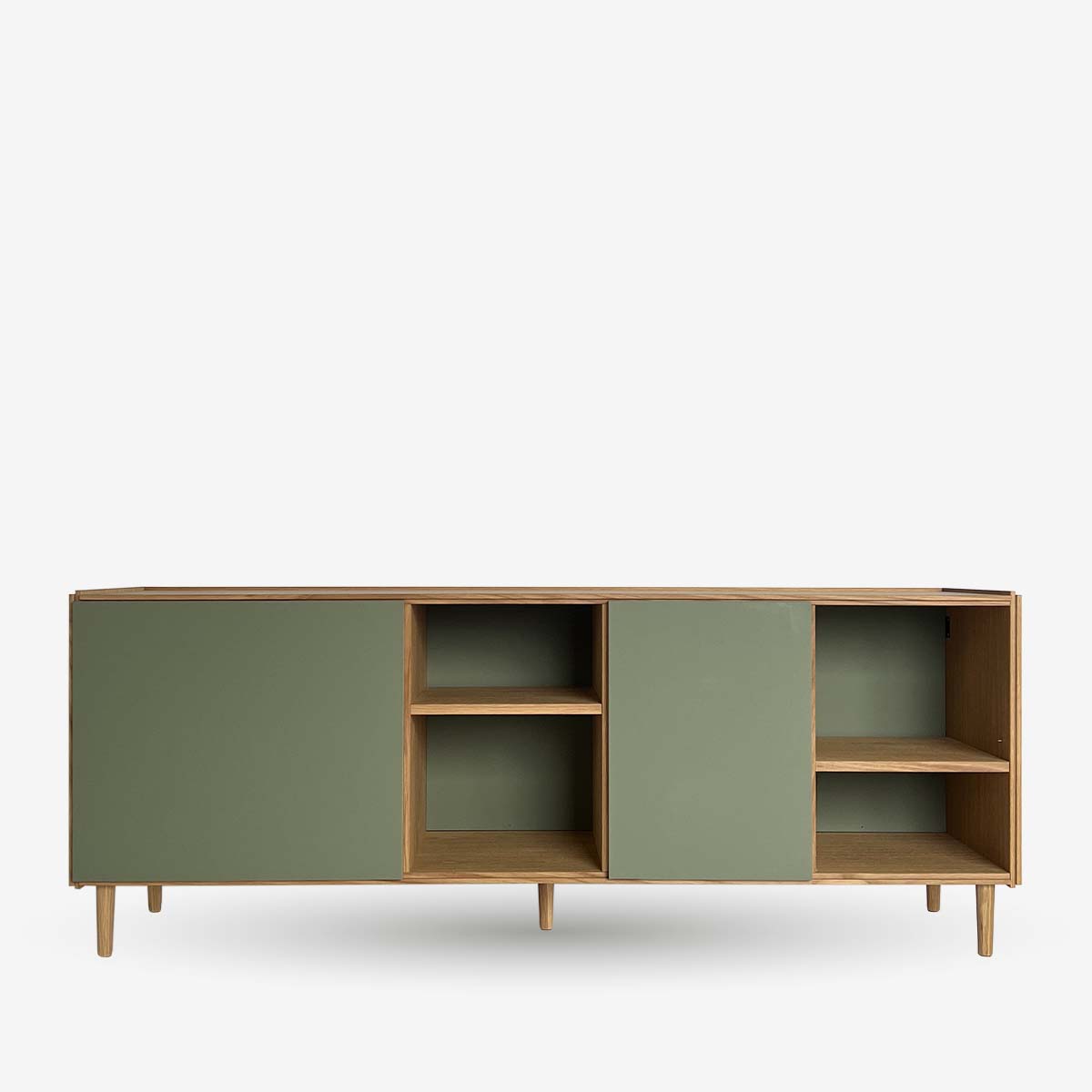 Fremstillet af højkvalitets egetræ kombinerer denne skræddersyede skænk funktion og design med elegante grønne fronter, der tilføjer et frisk, moderne præg. Det er fuldt tilpasseligt og tilbyder forskellige konfigurationer, så du kan vælge mellem skuffer, hylder og døre, alt efter dine opbevaringsbehov. Bag de stilfulde fronter er der rigelig opbevaringsplads – perfekt til at holde service, dekorative genstande eller øvrigt pænt gemt væk. Soft-close skuffer og justerbare hylder sikrer en god funktionalitet og fleksibilitet. Med sit alsidige design kan denne egetræsskænk problemfrit integreres i spisestuer, stuer eller entréer og fungerer som en praktisk opbevaringsløsning og et iøjnefaldende midtpunkt. Muligheden for at tilpasse farve og layout sikrer, at det passer til enhver indretningsstil. Denne skænk er mere end blot et møbel. Det er et smukt udført design, der tilfører både æstetisk appel og funktionalitet til dit hjem.