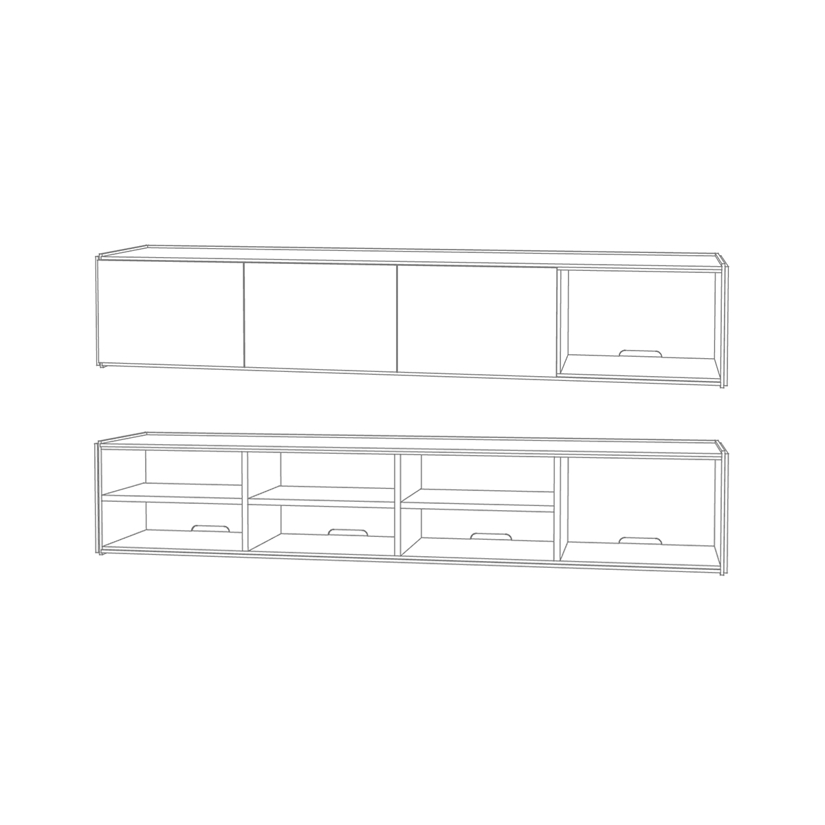 Tre sektioner med hylder og sorte stoflåger og én åben sektion.